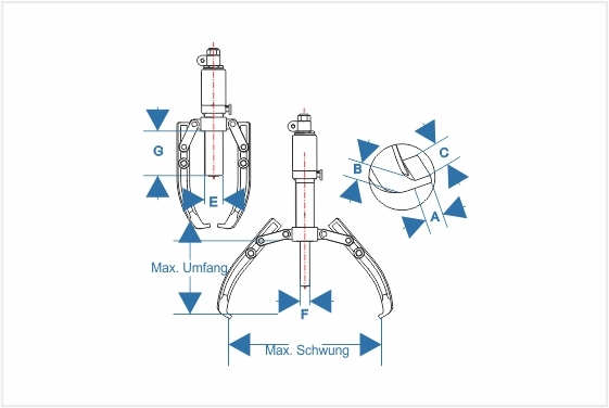 Dünne konische Klemmen für besseren Halt auf engem Raum. Einfaches Herausziehen großer Bauteile, die von einer Person ausgeführt werden können. Hochwertige geschmiedete Stahlbacken und -traversen bieten überragende Zuverlässigkeit. Aufgrund des zuverlässigen Backensicherungssystems erfassen die Abzieher Flächen, auf denen herkömmliche Abzieher gleiten, wie z. B. Kegellager.